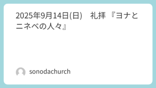礼拝 2025年9月14日(日) 礼拝 『ヨナとニネベの人々』 礼拝『ヨナとニネベの人々』 ヨナ3:1-10「神は、すべての人が救われて、真理を知るようになることを望んでおられます。」(Ⅰテモテ2:4)あらすじヨナはニネベの町で神様の言葉を語らねばならない預言者であった。そのため、“ニネベの人々が神様の... 2025.09.16 礼拝